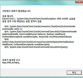 ORA-14400 오라클 오류 시스템 운영 중 갑자기 ORA-14400 오라클 오류 발생. '삽입된 분할 영역 키와 매핑되는 분할 영역이 없음' 처음보는 오류인데 왜 갑자기 뜨지..?? 아..확인 해보니 몇몇 테이블은 파티션을 년도, 월별로 나누어 저장되도록 되어 있었다. 양도 많고 해서 쌓여가는 데이터를 효율적으로 관리하기 위해,, 해결 방법은 해당 파티션 테이블 확인 후 생성해주면 된다. 파티션 테이블 확인 방법은 아래와 같음 select * from dba_tab_partitions where table_name = '테이블 명'; ■ 파티션 테이블이란 용량이 크고 지속적으로 증가하는 테이블들에 대해, 더 작은 단위로 나누어 저장하여 성능향상을 시켜줄 수 있는 테이블 ■ 파티션 테이블의 장점 파티션 테이블을 구성해둔다면, 데이터.. 더보기 이전 1 ··· 7 8 9 10 11 12 13 ··· 54 다음